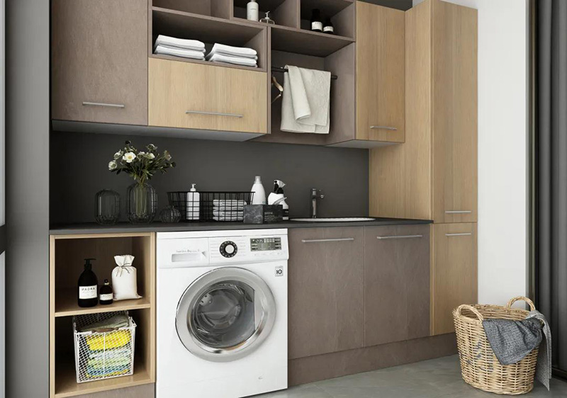 假如想要給陽臺柜留出更多收納空間,那么還可以選擇自帶烘干功能的洗衣機,一樣很方便。